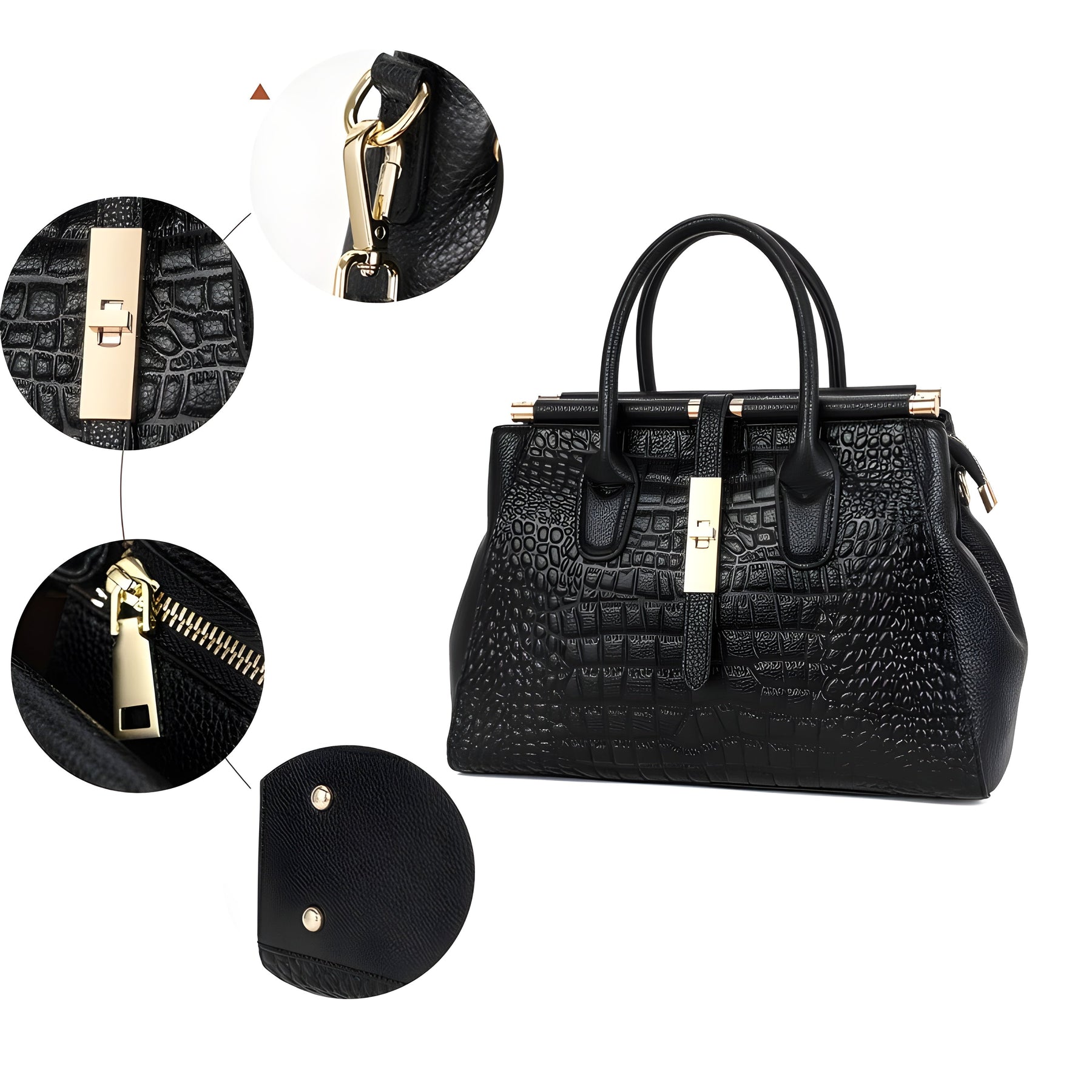 Eleganse møter sofistikering i denne utsøkte håndvesken, som har et luksuriøst preget alligatormønster på førsteklasses storfe-lær. Den strukturerte designen er både moderne og tidløs, mens den gullbelagte magnetiske lukkemekanismen gir en dristig kontrast mot den glatte svarte finishen, noe som øker dens stilige appell.